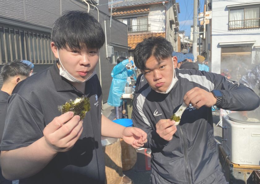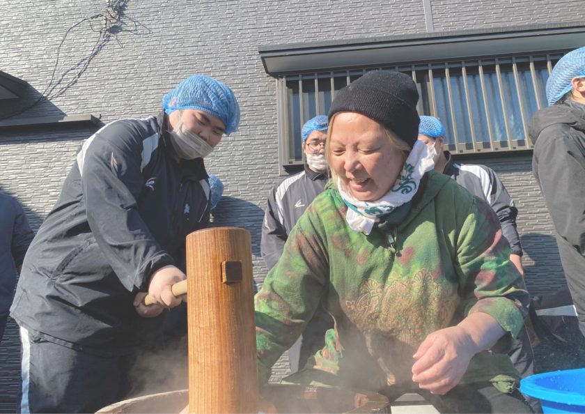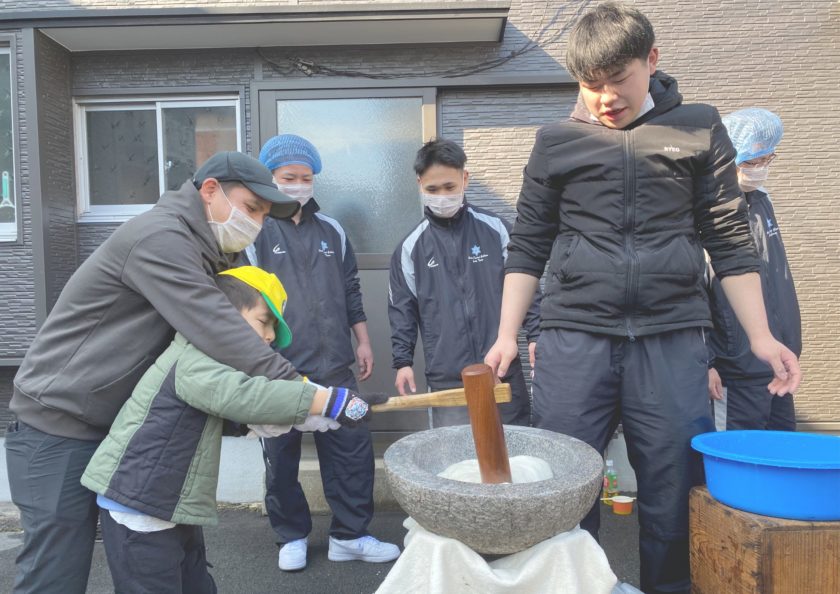 用意された100kgの餅米を、部員たちはレクチャーを受けながらお餅をついたり丸めたりと、地域の方々に混じらせていただき、普段のトレーニング成果を発揮しました。