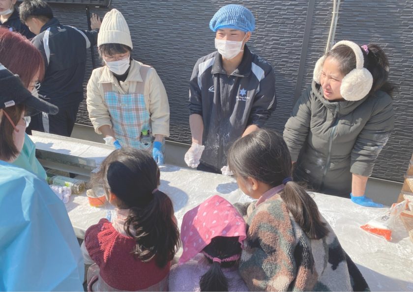 「◯◯さん!次いきますよ!」ベテランお母さんと、寒い中上着を脱いで連携をとる元気な部員。